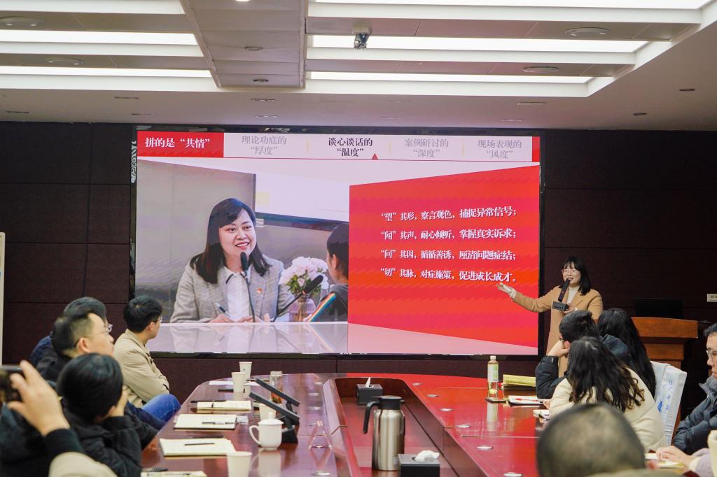 本次活动主讲人为四川省第十届辅导员素质能力大赛决赛优胜奖获得者、艺术学院辅导员唐铭和观摩本次比赛的辅导员代表雷非凡、汪美玲三位老师。唐铭结合参加决赛的经历,从赛事回顾、分项解析、临场应变及备赛策略四个维度作了分享报告,围绕基础知识测试、学情分析、谈心谈话、案例研讨四个比赛环节,深入剖析了备考策略、核心要点与临场应变技巧,强调了将理论知识与工作实践深度融合的重要性。雷非凡聚焦辅导员专业化建设,重点分析了比赛从案例分析向案例研讨的转变,以及新赛制在综合运用理论知识、逻辑思辨、协同合作等方面的新要求。汪美玲以“厚度、深度、温度、风度”概括了优秀辅导员的职业底色,通过生动的案例展示了如何在谈心谈话中实现从情绪疏导到价值引领的转化,引发了在场辅导员的强烈共鸣。