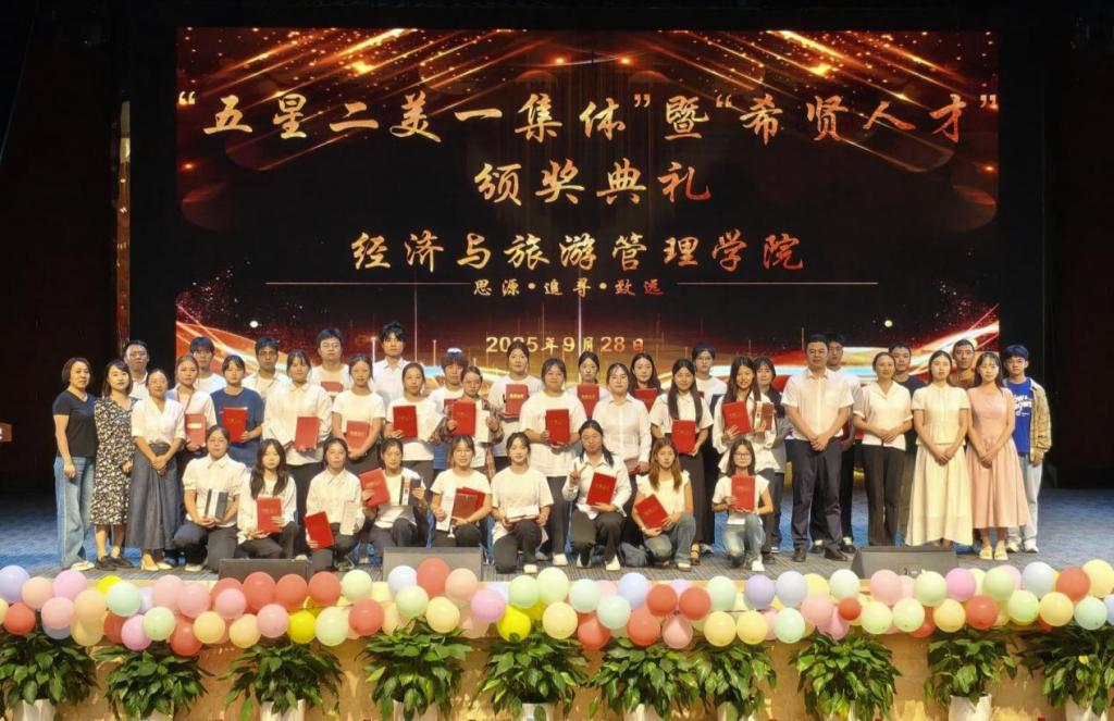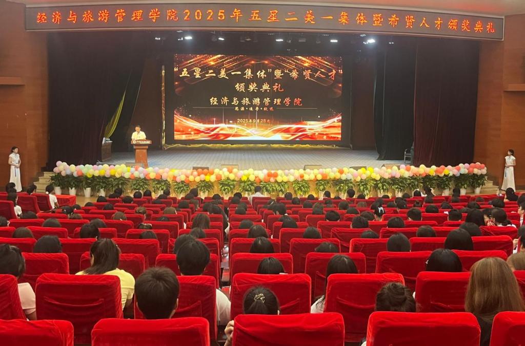9月28日晚,经济与旅游管理学院2025年“五星二美一集体”颁奖典礼在学校杏坛隆重举办。学院党总支书记吴小平、副书记杨燕、学生科科长贺智力、辅导员,以及获奖学生和2025级学生共同出席典礼。颁奖典礼在庄严的国歌声中拉开帷幕。