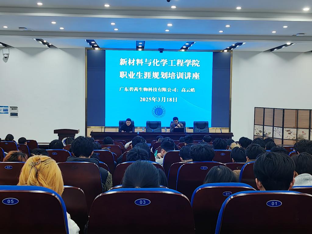 为引导学生科学规划职业生涯,深化产教融合育人理念,3月18日晚,新材料与化学工程学院在先圣厅举办职业生涯规划讲座。活动特邀广东碧茜生物科技有限公司人事部经理高云皓先生担任主讲嘉宾,学院大二全体学生参与学习,王丰老师主持活动。