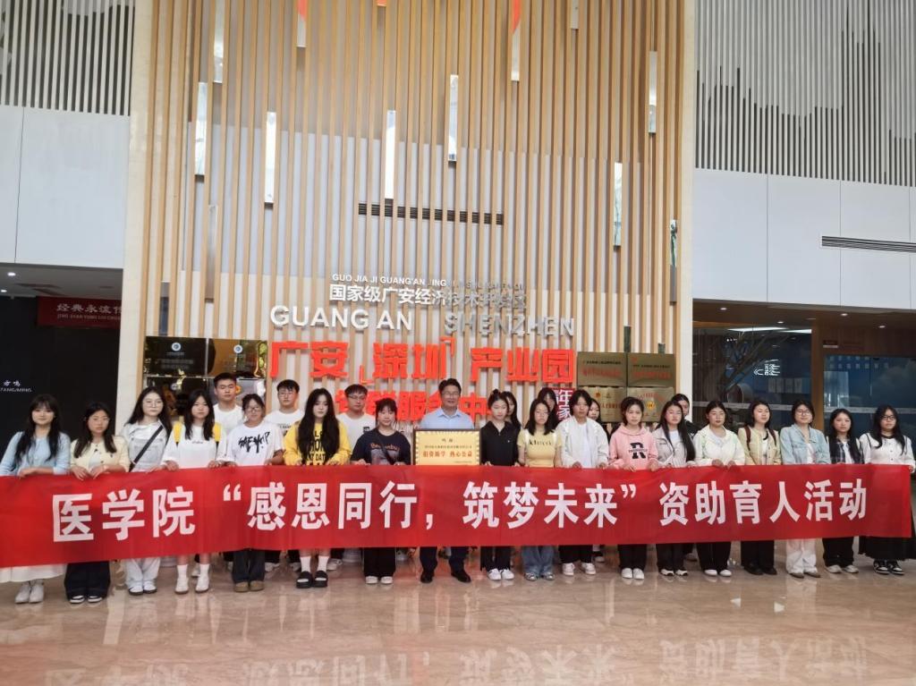 为深入贯彻落实国家资助政策,深化资助育人成效,激励受助学生奋发自强、感恩奉献,4月23日下午,医学院组织开展“感恩同行,筑梦未来”资助育人走进广安深广产业园研学活动。2024年度“易人和奖学金”获奖学生及新生助学金获得者等30余名学生参加活动。易人和科技集团有限责任公司董事长罗中华,医学院党总支书记喻忠,党总支副书记吴黎明,组织员汪建宏,学生科科长陈江及学生科全体教师及辅导员代表出席。